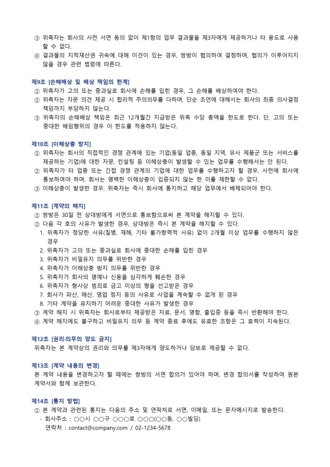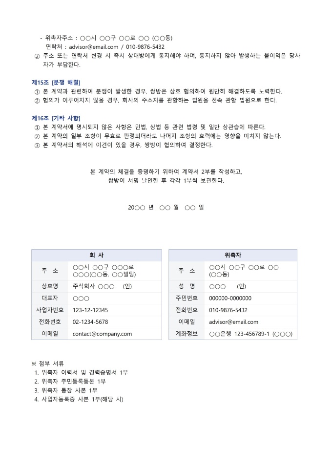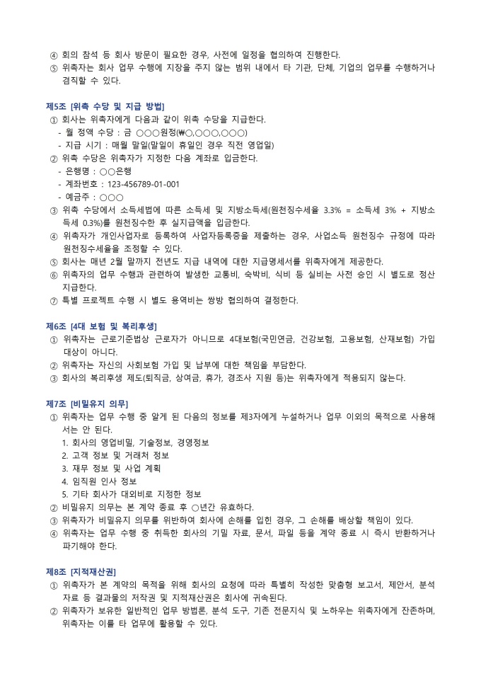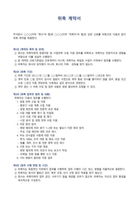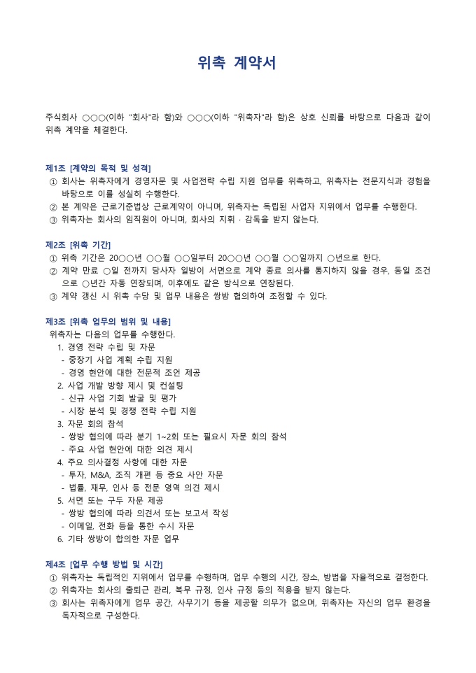 위촉 계약서 서식입니다. 위촉 계약서는 회사가 특정 업무나 프로젝트를 외부 전문가에게 일정 기간 동안 맡기고, 그 대가로 수당을 지급하기로 약속하는 계약서입니다. 고용 계약과 달리 위촉자는 독립적 지위에서 업무를 수행하며 회사의 직접적인 지휘·감독을 받지 않습니다.
