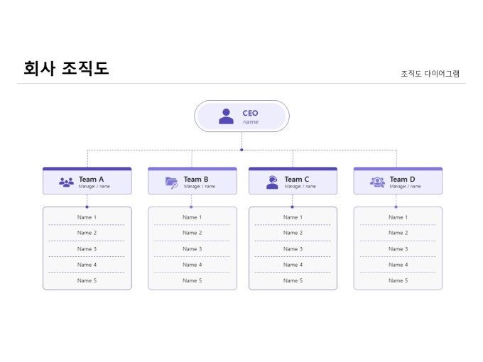 조직도 다이어그램(회사)입니다. 회사를 주제로 제작된 조직도 다이어그램입니다. CEO를 중심으로 각 팀이 유기적으로 협력하며 업무를 수행하는 조직 구조를 보여줍니다. 팀별 역할과 인원 구성을 한눈에 파악할 수 있도록 시각적으로 표현한 다이어그램입니다.