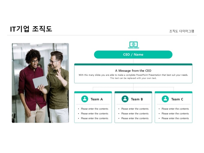 조직도 다이어그램(IT 기업)입니다. IT 기업을 주제로 제작된 조직도 다이어그램입니다. CEO를 중심으로 각 팀이 유기적으로 협력하며 업무를 수행하는 조직 구조를 보여줍니다. 팀별 역할과 인원 구성을 한눈에 파악할 수 있도록 시각적으로 표현한 다이어그램입니다.