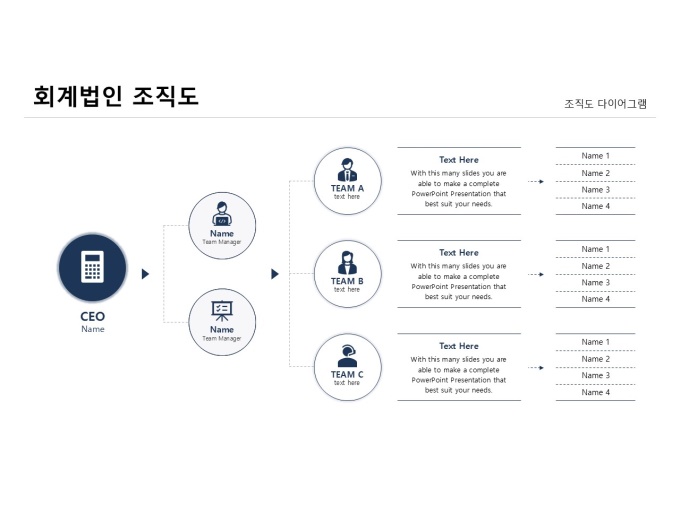 조직도 다이어그램(회계법인)입니다. 회계법인를 주제로 제작된 조직도 다이어그램입니다. CEO를 중심으로 각 팀이 유기적으로 협력하며 업무를 수행하는 조직 구조를 보여줍니다. 팀별 역할과 인원 구성을 한눈에 파악할 수 있도록 시각적으로 표현한 다이어그램입니다.