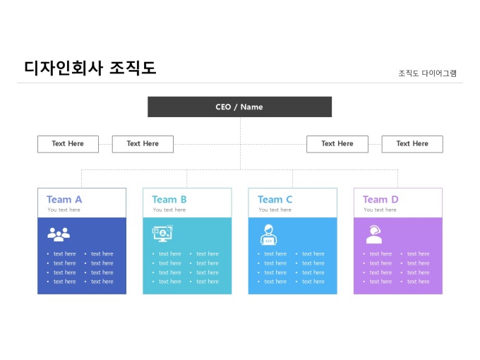 조직도 다이어그램(디자인회사)입니다. 디자인회사를 주제로 제작된 조직도 다이어그램입니다. CEO를 중심으로 각 팀이 유기적으로 협력하며 업무를 수행하는 조직 구조를 보여줍니다. 팀별 역할과 인원 구성을 한눈에 파악할 수 있도록 시각적으로 표현한 다이어그램입니다.