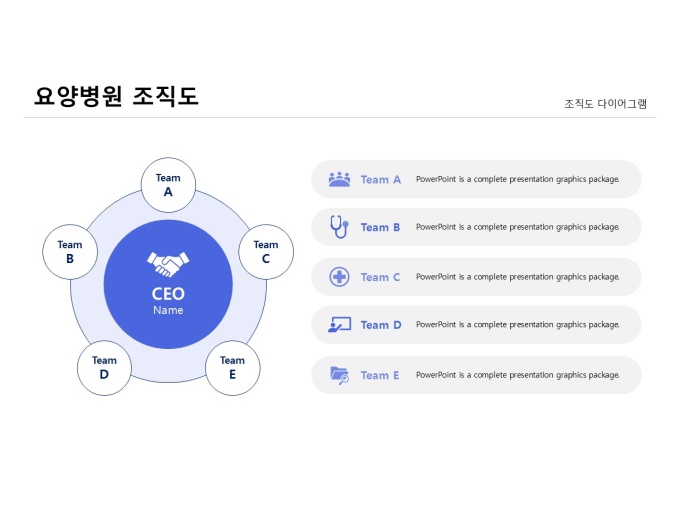 조직도 다이어그램(요양병원)입니다. 요양병원을 주제로 제작된 조직도 다이어그램입니다. CEO를 중심으로 각 팀이 유기적으로 협력하며 업무를 수행하는 조직 구조를 보여줍니다. 팀별 역할과 인원 구성을 한눈에 파악할 수 있도록 시각적으로 표현한 다이어그램입니다.
