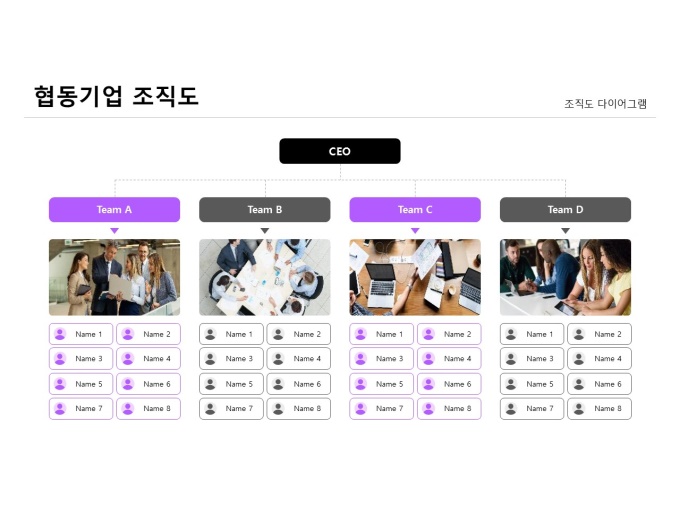 조직도 다이어그램(협동기업)입니다. 협동기업을 주제로 제작된 조직도 다이어그램입니다. CEO를 중심으로 각 팀이 유기적으로 협력하며 업무를 수행하는 조직 구조를 보여줍니다. 팀별 역할과 인원 구성을 한눈에 파악할 수 있도록 시각적으로 표현한 다이어그램입니다.