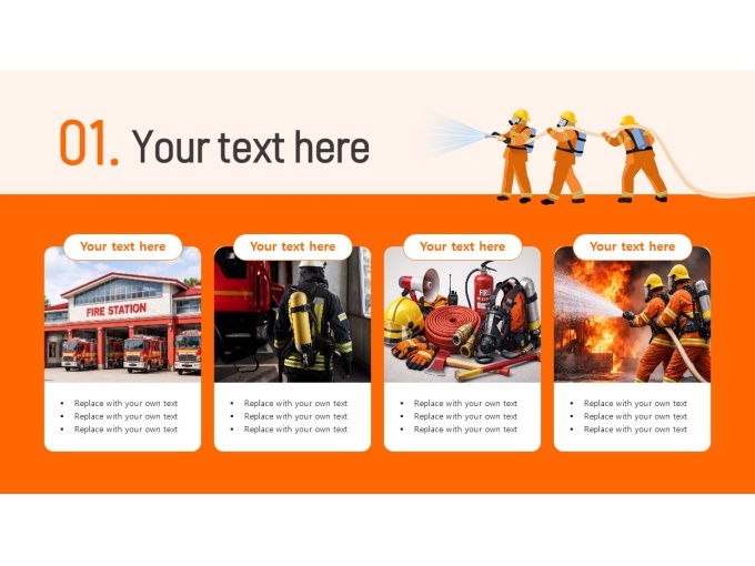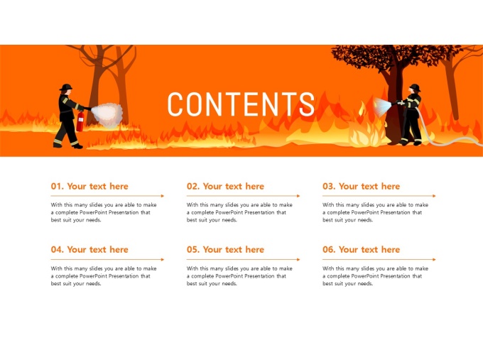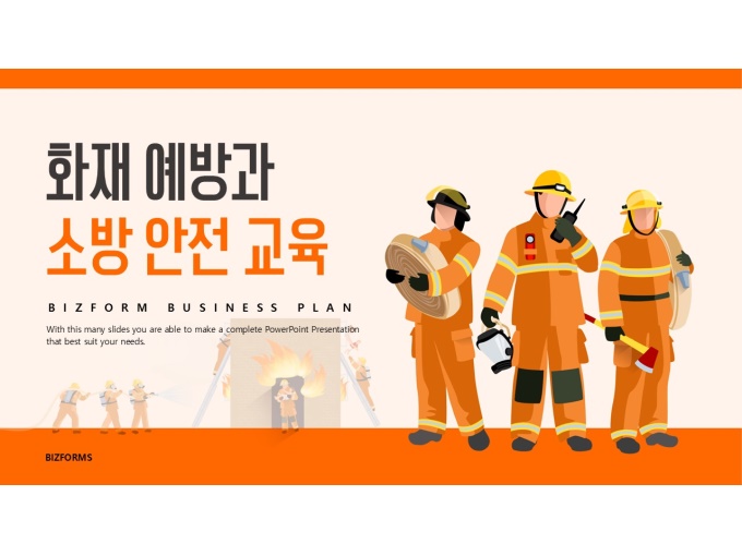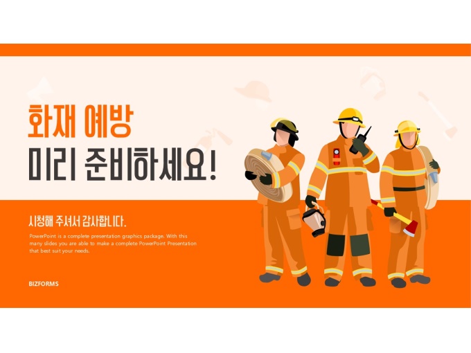 파워포인트배경(화재예방과소방교육)으로, 표지·목차·내지·간지·다이어그램·끝표지로 구성된 실용적인 템플릿입니다. 소방관과 화재 대응 장비 일러스트를 활용해 화재 예방 및 안전 교육 주제에 적합하도록 디자인되어 교육 내용의 이해도와 전달력을 높일 수 있습니다. 특히 소방 안전 교육, 화재 예방 교육, 산업안전 교육, 재난 대응 훈련 안내 등 다양한 교육 및 안내 자료 제작에 활용하기 좋습니다. 화재예방 PPT, 소방안전교육 파워포인트, 안전교육 프레젠테이션 템플릿을 찾는 사용자에게 적합한 디자인입니다..