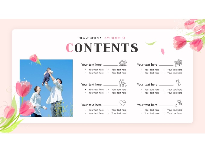 파워포인트배경(가족과함께하는가정의달)로, 표지·목차·내지·간지·다이어그램·끝표지로 구성된 가정의 달 맞춤형 프레젠테이션 템플릿입니다. 화사한 꽃 일러스트와 부드러운 색감을 활용해 가정의 달 행사 안내와 가족 참여 프로그램 발표에 어울리도록 따뜻한 분위기로 디자인되었습니다. 특히 어린이집 및 유치원 가정의 달 행사 안내, 가족 참여 수업 소개, 5월 기념행사 프로그램 발표 등 다양한 교육 및 행사 안내 자료로 활용하기 적합합니다. 가정의달 PPT 배경, 5월 행사 발표자료, 가족 행사 안내 프레젠테이션, 어린이집 유치원 PPT 템플릿을 찾는 사용자에게 적합한 디자인입니다.